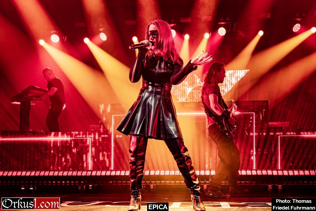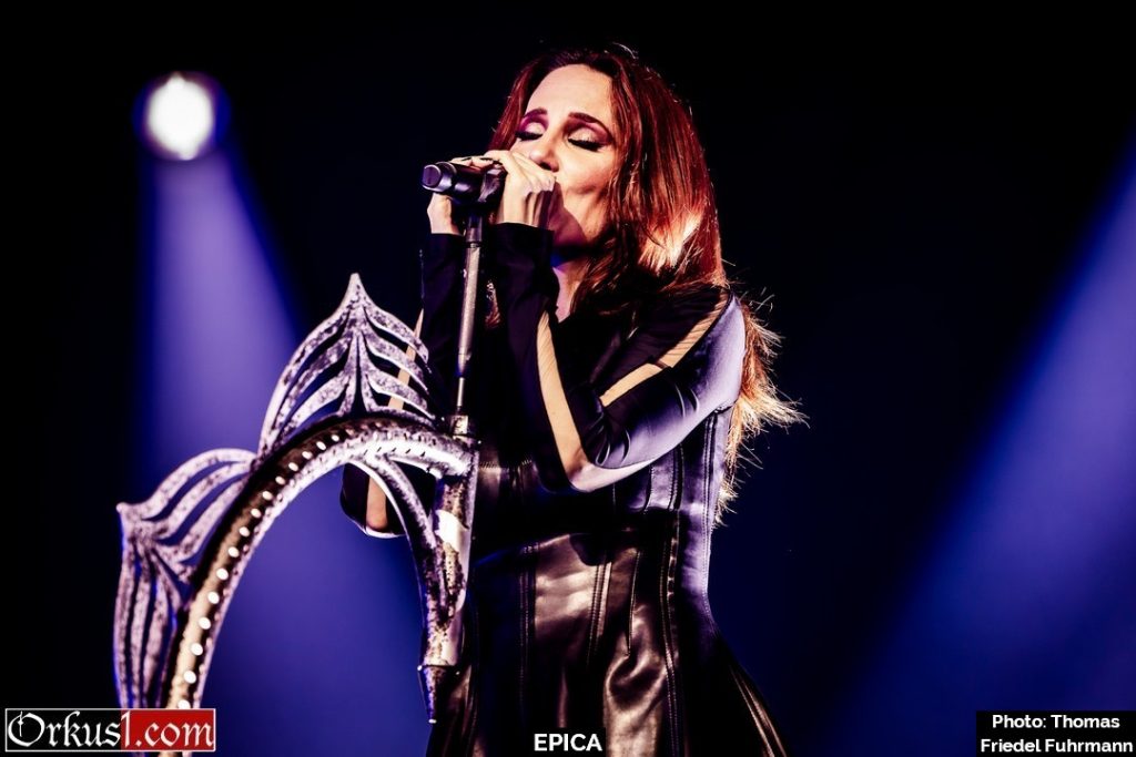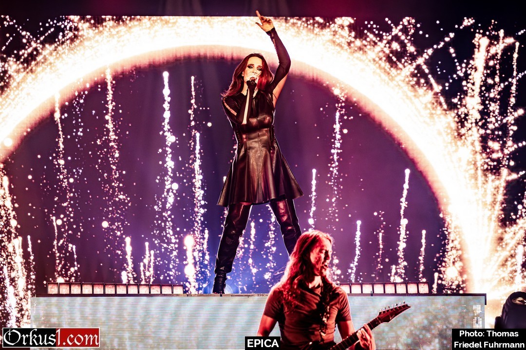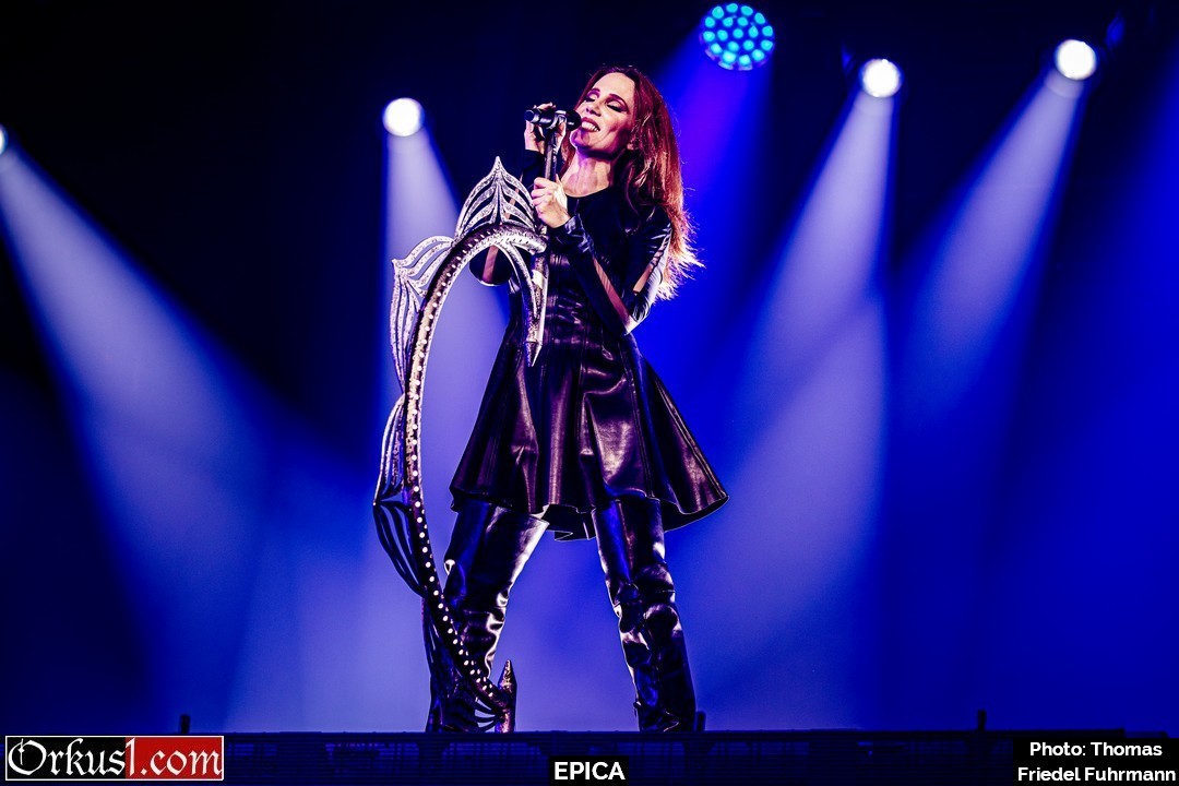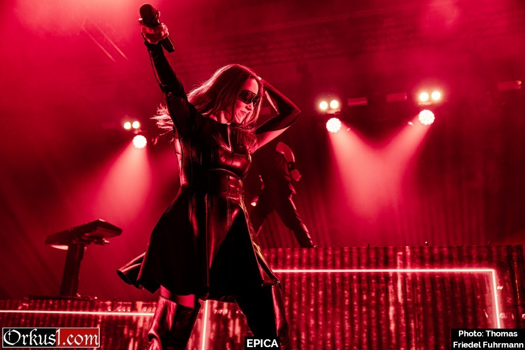 Als das Licht erneut erlosch, lag plötzlich eine spürbare Spannung im Raum. Nebel kroch über die Bühne, orchestrale Klänge waberten durch die Halle – dann brach mit „Apparition“ der erste Soundsturm los. Ein wuchtiger Einstieg, der sofort klarmachte: Epica waren heute gekommen, um die Arena zu übernehmen. Direkt danach folgte „Cross the Divide“, dessen treibende Gitarren und hymnischer Refrain die Menge sofort mitrissen. Und im Fotograben wurde es plötzlich eng, als Simone Simons an den Bühnenrand trat und die ersten Reihen komplett ausrasteten. Mit „Martyr of the Free Word“ folgte dann der erste echte Nackenschlag des Abends. Die Riffs fraßen sich durch die Halle, während Simone Simons scheinbar mühelos über der Gitarrenwand schwebte. Danach drückte „Eye of the Storm“ das Tempo weiter nach vorn – eine brachiale Mischung aus orchestraler Größe und metallischer Wucht. Später sorgten „Unleashed“ und „Never Enough“ für den ersten großen Mitsingmoment. Das Publikum ging sofort mit, Arme in der Luft, Stimmen im Chor. Ein besonderer Moment folgte mit „Sirens – Of Blood and Water“, bei dem Charlotte Wessels noch einmal auf die Bühne zurückkehrte. Zwei Stimmen, die sich perfekt ergänzten, während darunter eine massive Klangwand aufgezogen wurde. Mit „Tides of Time“ wurde es kurz atmosphärischer, bevor sich das Set mit „The Grand Saga of Existence“ wieder in monumentale Klangdimensionen aufschwang.