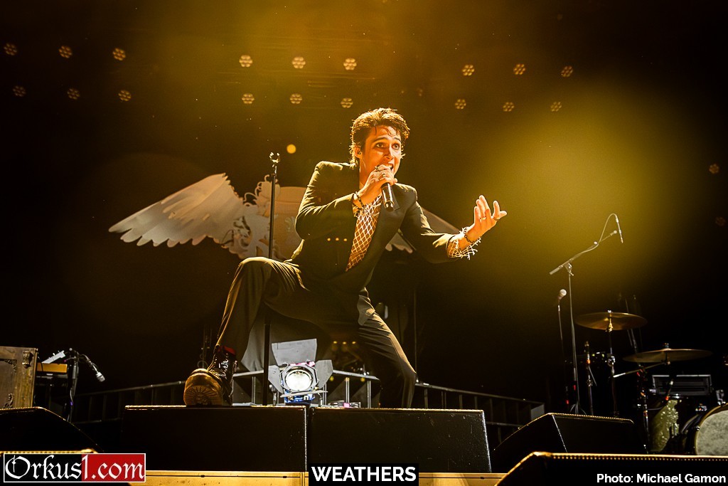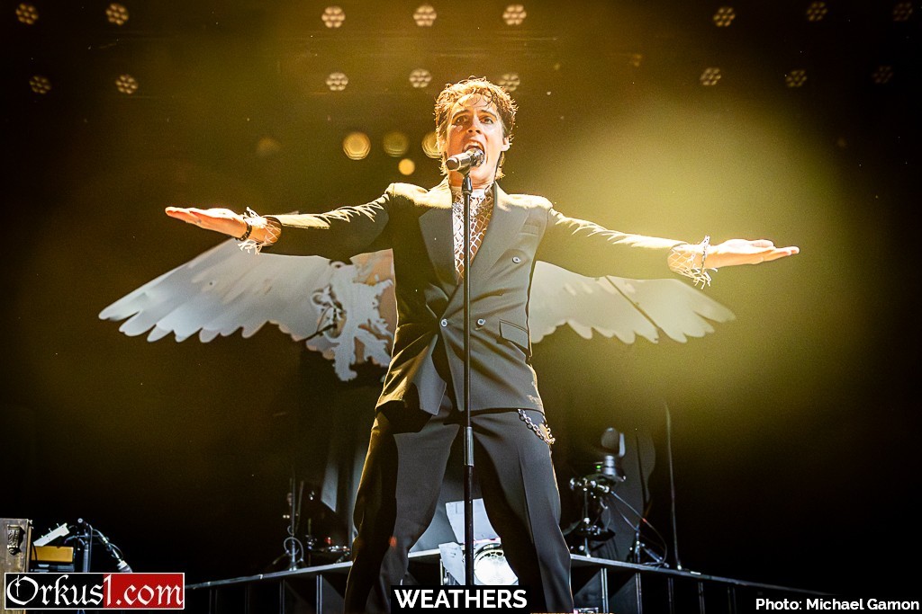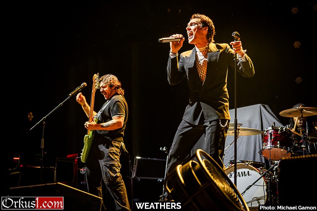 The evening was opened by the band Weathers. Although admission was delayed by around 15 minutes, the quartet started on schedule at 19:00. The hall gradually filled up as the first songs began to play. Even before the doors opened, it was clear that safety was the top priority. The fans were directed into orderly lanes with fluttering ribbons before Securities led the crowd in rows of two and at a decidedly leisurely pace directly in front of the stage. Admission couldn’t be more civilized. Weathers, whose style is somewhere between alternative rock and indie pop/rock, finally took to the stage. Singer Cameron Boyer immediately caught the eye: in a black suit with a white mesh shirt underneath and glitter on his temples. Right at the beginning, “Happy Pills” put everyone in a good mood – a song that strikes a balance between pop lightness and a reflective note. With a greeting to the Düsseldorf audience (“Germany, how are you doing tonight? We are Weathers from Los Angeles, California.”), the band immediately established a connection.