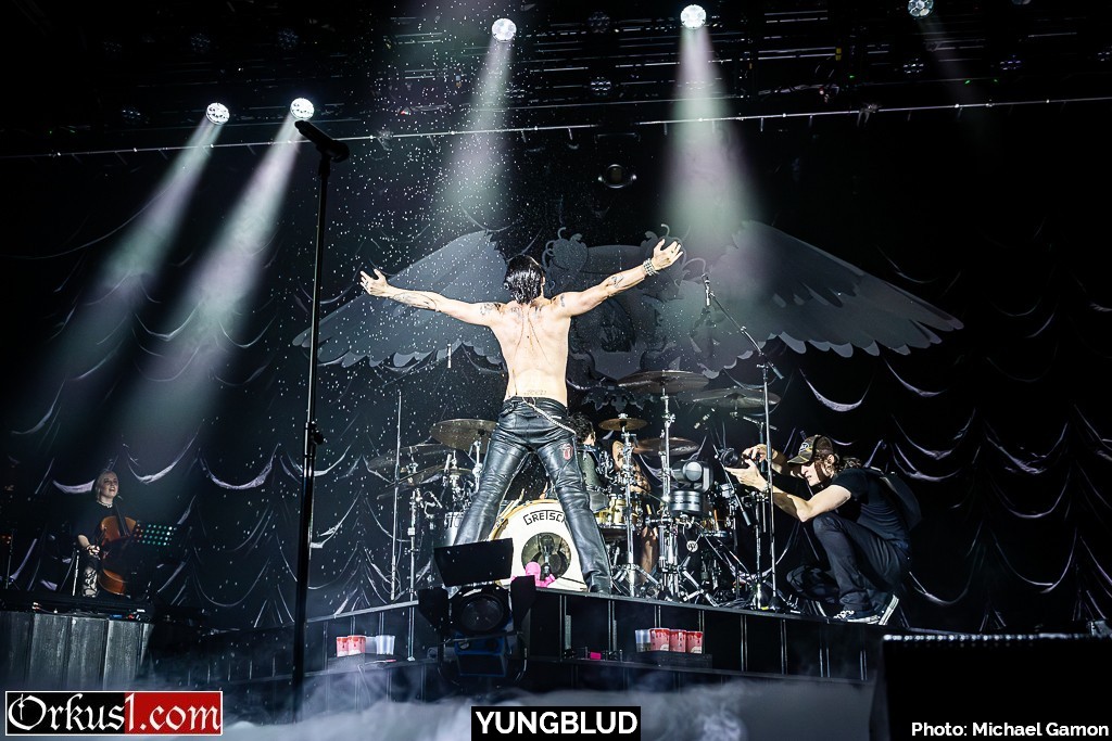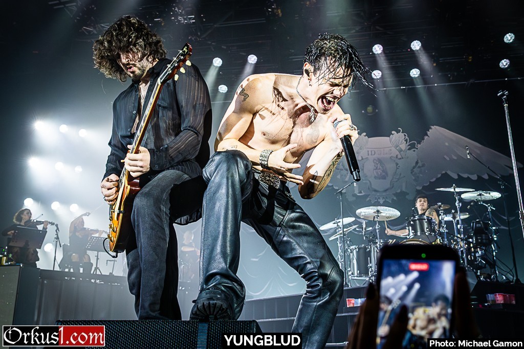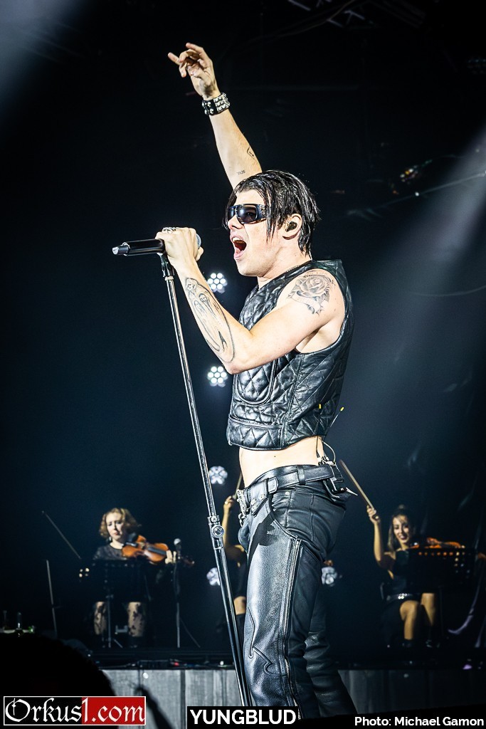 Shouts of “Ozzy” broke out as the melody of Black Sabbath’s “Changes” began. Dom looked up, fleetingly kissed the cross on his chain and raised his drink: “You know, I sing this song to a dear friend of mine in the sky tonight, dear Düsseldorf. I wanna dedicate this song to Mr. Ozzy fucking Osbourne. A man that I believe is the reason, why some of us know each other, right? Is this anybody’s first ever Yungblud show tonight? Holy shit, welcome to the family. Cheers, cheers!” He threw his cup far into the crowd. Then he became serious: “It feels so strange to me, singing this song tonight in Düsseldorf. Because when we lost Ozzy, I thought I would sing this song for the rest of my life to keep that motherfucker’s legacy alive, man! ‘Cause this is rock’n’roll music – and rock’n’roll is about love! Ozzy Osbourne was about love! Yungblud is about love. You motherfuckers are about love, man! Now Düsseldorf, can I ask of you one thing? I want everybody to look right and to look left to the person next to him right now. Say hello motherfucker. Say I love you! And now, sing this song ‘Changes’ with me.”