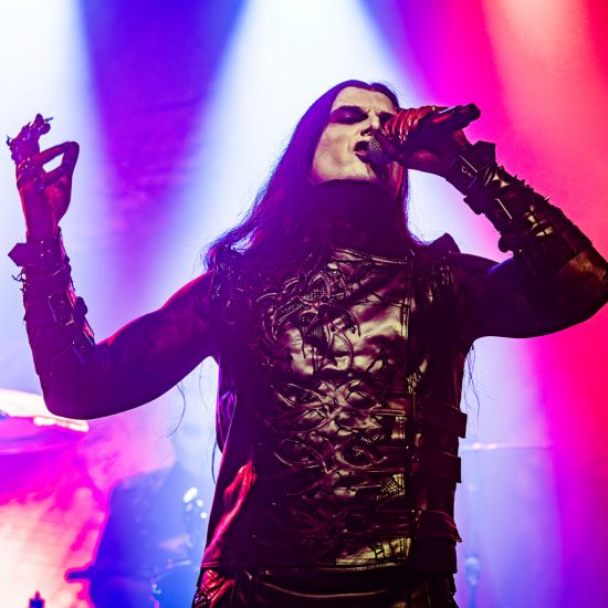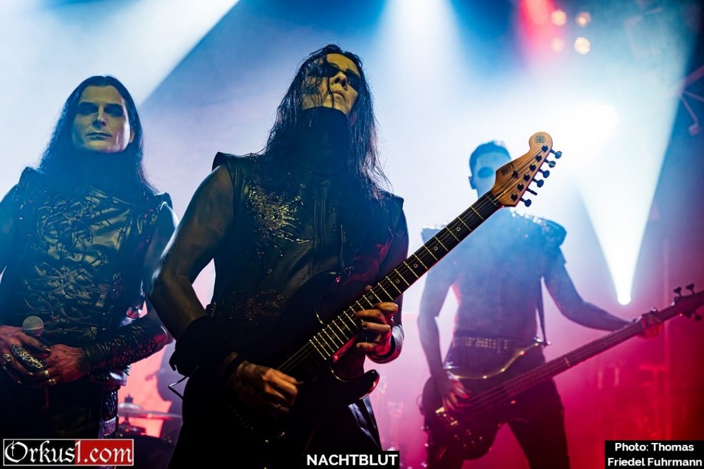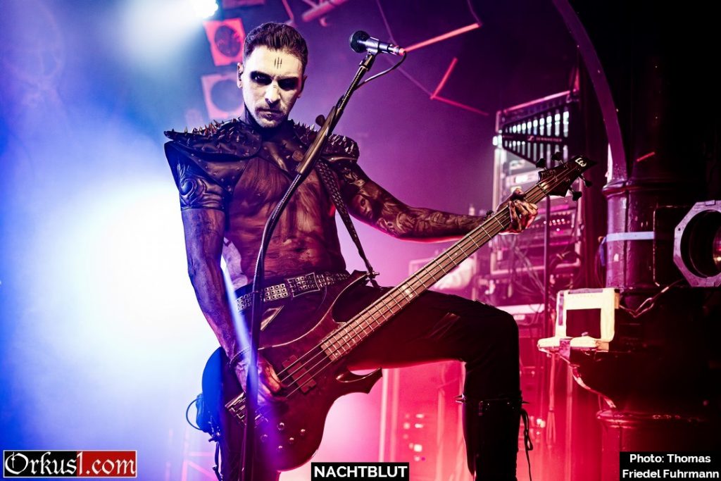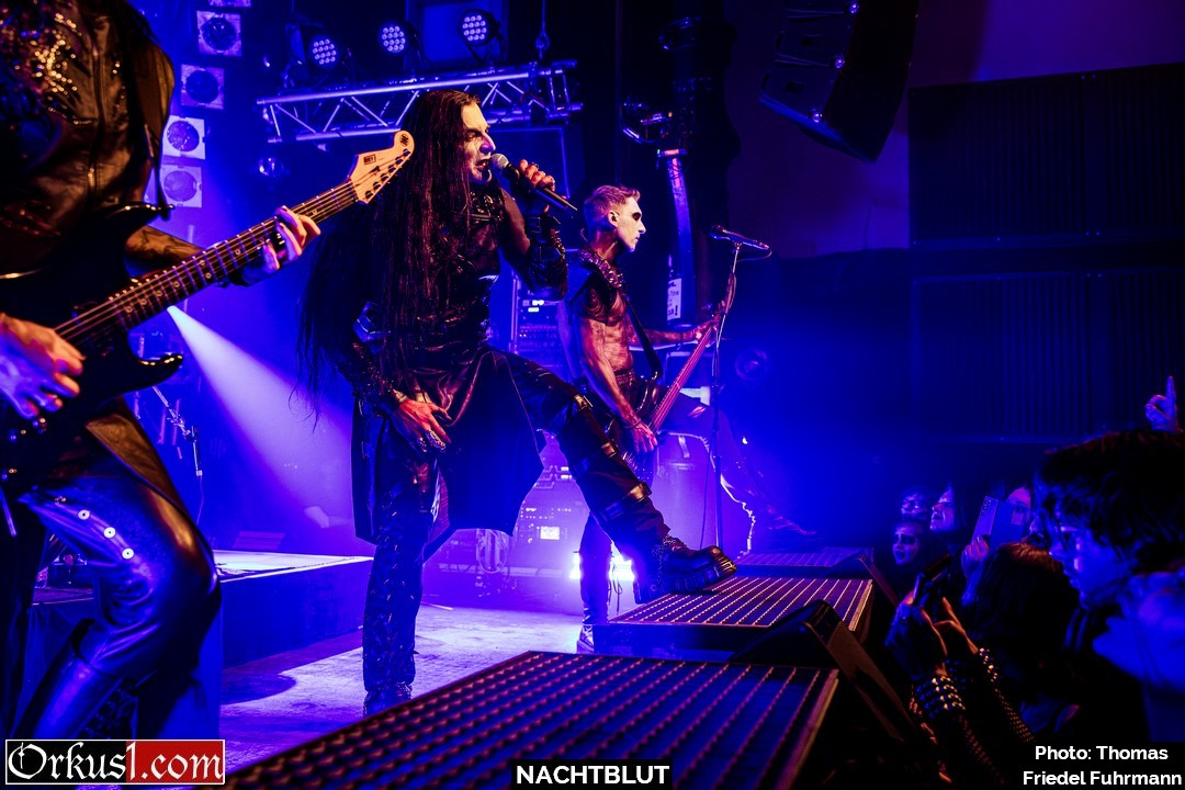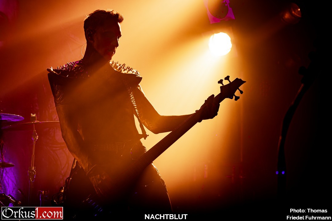 Ohne Umschweife kommen Nachtblut zur Sache: Ein Schlag – dann „Von Hass getrieben“. Der Einstieg kommt hart, kompromisslos, ohne Zeit zum Sammeln. Mit „Nachtgeweiht“ und „Kaltes Herz“ zieht die Band den Kreis enger, die Gitarren schneiden scharf, das Schlagzeug drückt unerbittlich nach vorn. Später lassen „Manchmal kommen sie wieder“ und der Titeltrack „Todschick“ – live noch bissiger als auf dem Album – keinen Zweifel daran, wer hier das Kommando hat. „Kalt wie Grab“ und „Amok“ erhöhen weiter den Druck, bevor mit „Mein ist die Hölle“ die Temperatur endgültig kippt. Hier wird mit Tabus gespielt wie mit Streichhölzern an einer Tankstelle. Das Publikum singt nicht nur mit – es brüllt. Askeroth steht da wie ein düsterer Zeremonienmeister, der seine Gemeinde durch eine kontrollierte Apokalypse führt. „Der Tod ist meine Nutte“ kommt provokant, schmutzig, bitterironisch. „Stirb langsam“ zieht das Tempo weiter an, treibt den Pit in Wallung, zwingt Bewegung in jede Ecke des Knust, während „Leierkinder“ die dunklere, fast zynische Seite betont – als würde die Band für einen Moment das Skalpell auspacken, statt nur den Hammer. Mit „Die Toten vergessen dich“ wird es später epischer. Der Song zieht wie ein kalter Wind durch die Reihen und trägt dennoch vorwärts. Man spürt diese Mischung aus Trotz und Tragik.